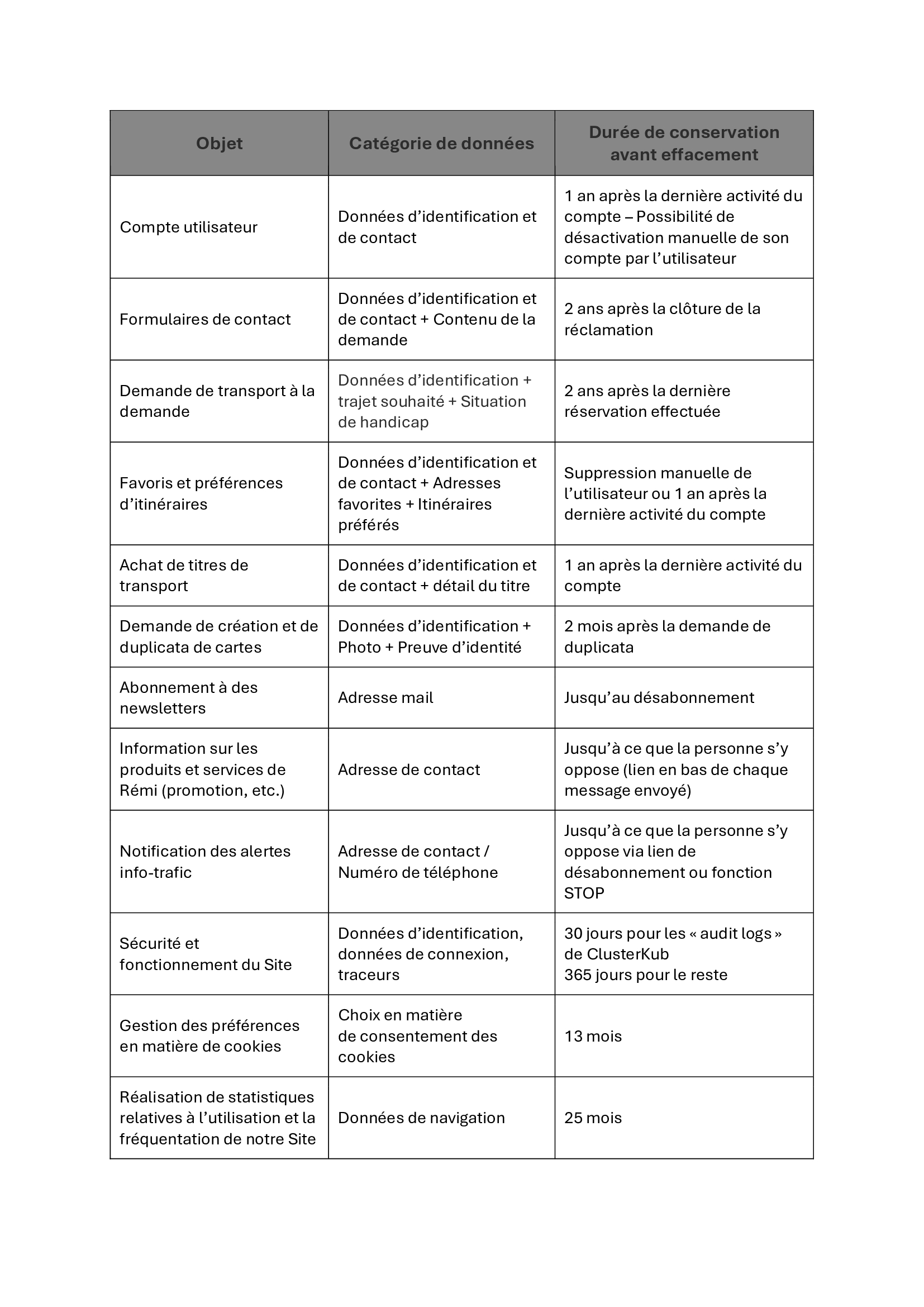 Le tableau ci-dessous vous indique les durées de conservation en fonction du type de données collectées :